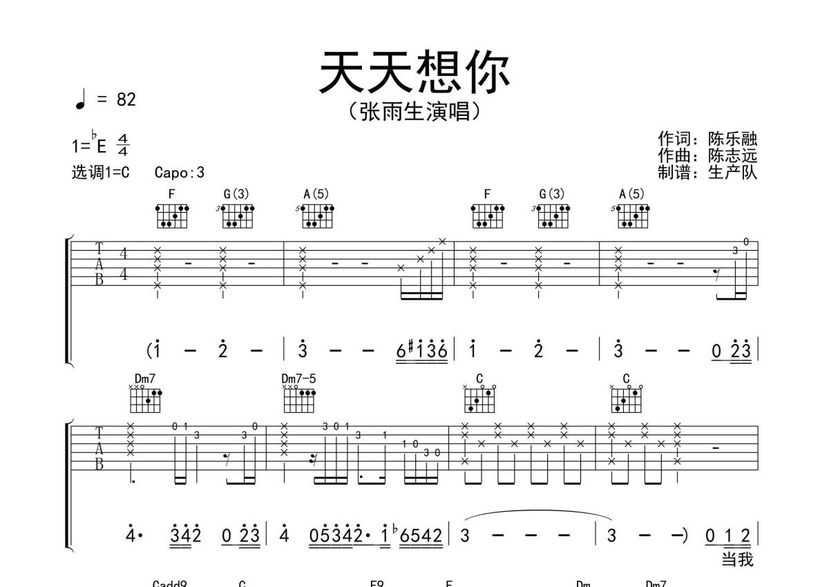 《天天想你》是张雨生演唱的一首歌曲,拍号为4/4拍,歌曲速度为每分钟82拍,歌曲原调为Eb调,但由于原调指法比较难,为了方便弹奏,本吉他谱采用的是C调指法编配,变调夹3品弹奏即为原调,当然也可以根据自己的音域改变变调夹位置,或者通过改变和弦调性,以方便自己弹奏,这份吉他谱共有三张高清图谱,图谱由 @生产队 编配上传,图谱使用六线谱编配,包含吉他和弦指法、简谱以及歌词部分,使用这份天天想你吉他谱,可以让你更加方便地掌握这首歌曲的弹唱技巧,快来尝试吧。