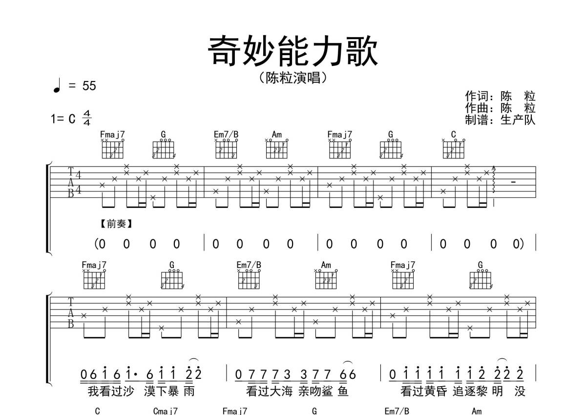 《奇妙能力歌》是陈粒演唱的一首歌曲,拍号为4/4拍,歌曲速度为每分钟55拍,歌曲原调为C调,本吉他谱采用的是C调指法编配,演奏时不需要使用变调夹即为原调,这份吉他谱共有三张高清图谱,图谱由 @生产队 编配上传,图谱使用六线谱编配,包含吉他和弦指法、简谱以及歌词部分,使用这份奇妙能力歌吉他谱,可以让你更加方便地掌握这首歌曲的弹唱技巧,快来尝试吧。