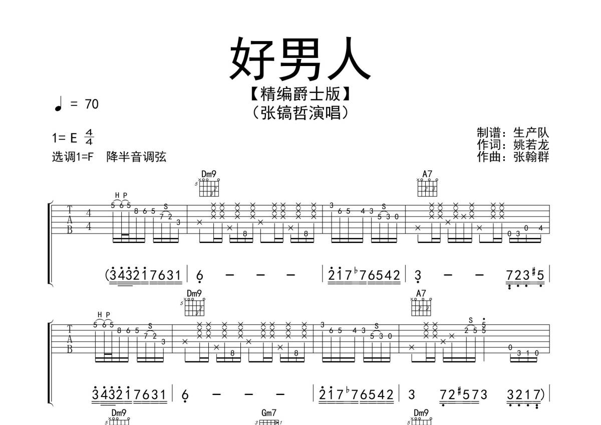 《好男人》是张镐哲演唱的一首歌曲,拍号为4/4拍,歌曲速度为每分钟70拍,歌曲原调为E调,但由于原调指法比较难,为了方便弹奏,本吉他谱采用的是F调指法编配,降半音调弦弹奏即为原调,当然也可以根据自己的音域决定是否调弦,这份吉他谱共有三张高清图谱,图谱由 @生产队 编配上传,图谱使用六线谱编配,包含吉他和弦指法、简谱以及歌词部分,使用这份好男人吉他谱,可以让你更加方便地掌握这首歌曲的弹唱技巧,快来尝试吧。