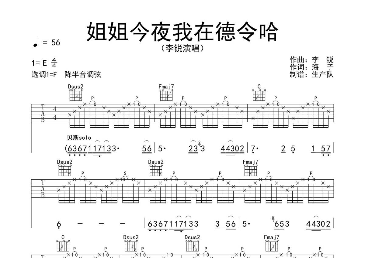 李锐《姐姐今夜我在德令哈》吉他谱 - F调弹唱六线谱