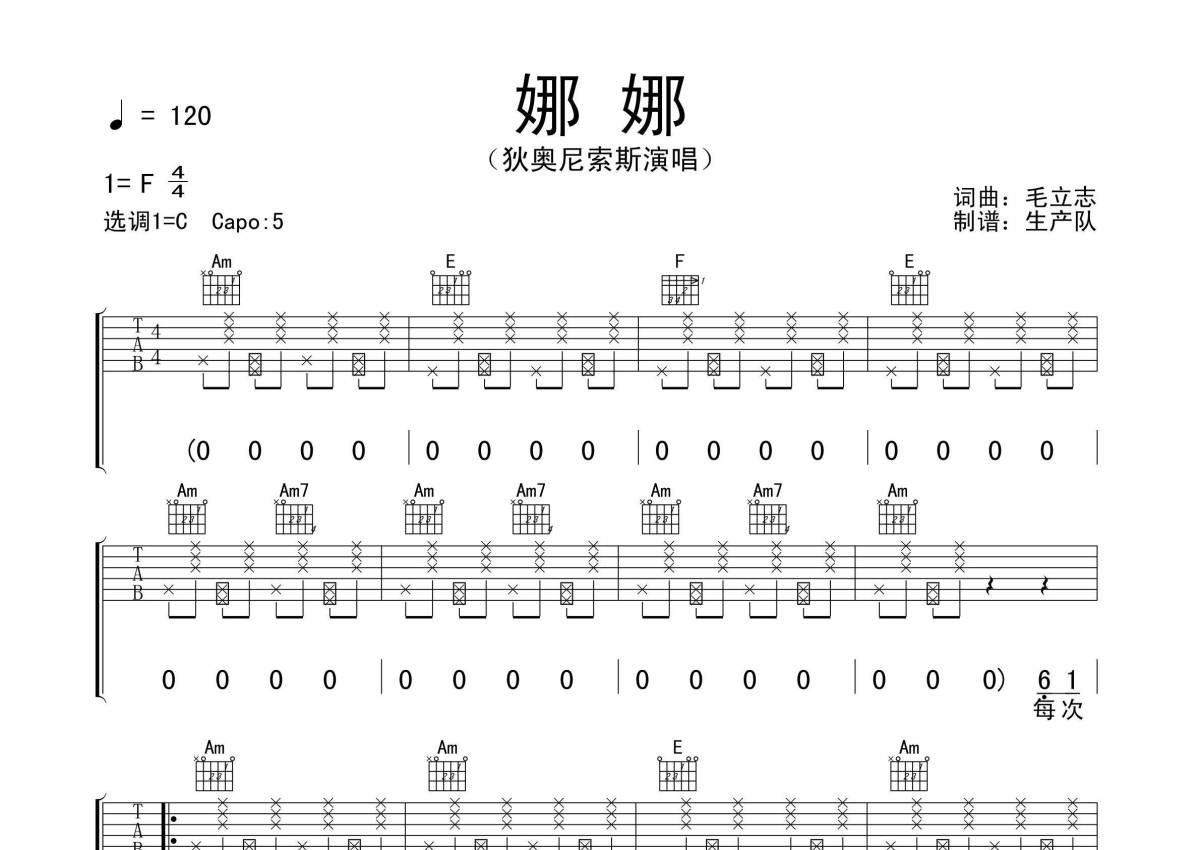 《娜娜》是狄奥尼索斯乐队演唱的一首歌曲,拍号为4/4拍,歌曲速度为每分钟120拍,歌曲原调为F调,但由于原调指法比较难,为了方便弹奏,本吉他谱采用的是C调指法编配,变调夹5品弹奏即为原调,当然也可以根据自己的音域改变变调夹位置,或者通过改变和弦调性,以方便自己弹奏,这份吉他谱共有四张高清图谱,图谱由 @生产队 编配上传,图谱使用六线谱编配,包含吉他和弦指法、简谱以及歌词部分,使用这份娜娜吉他谱,可以让你更加方便地掌握这首歌曲的弹唱技巧,快来尝试吧。