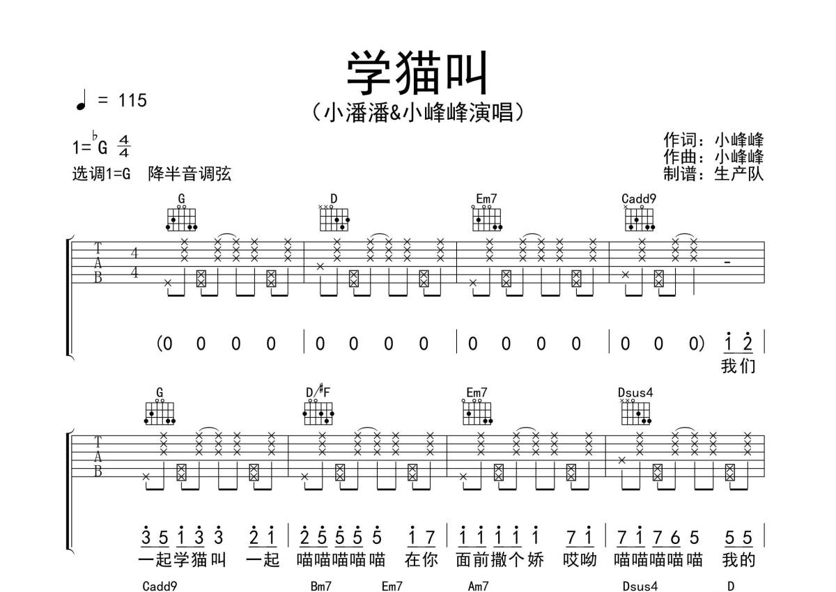 小潘潘/小峰峰《学猫叫》吉他谱 - G调弹唱六线谱