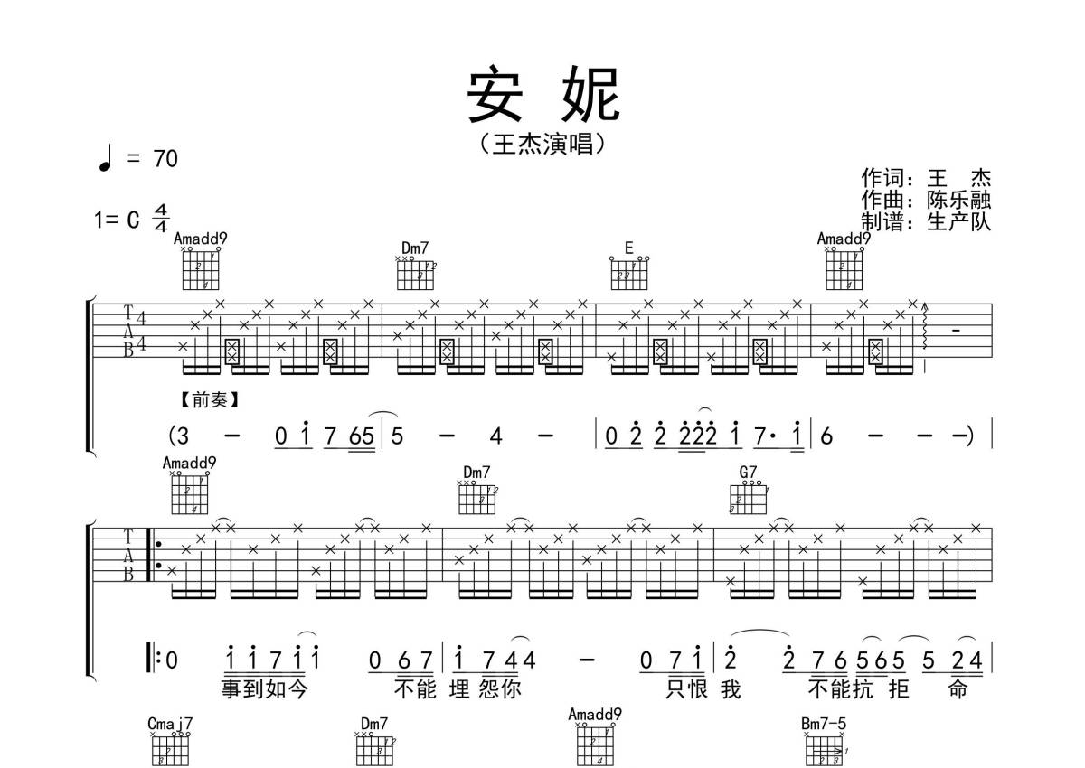 王杰《安妮》吉他谱 - C调弹唱六线谱