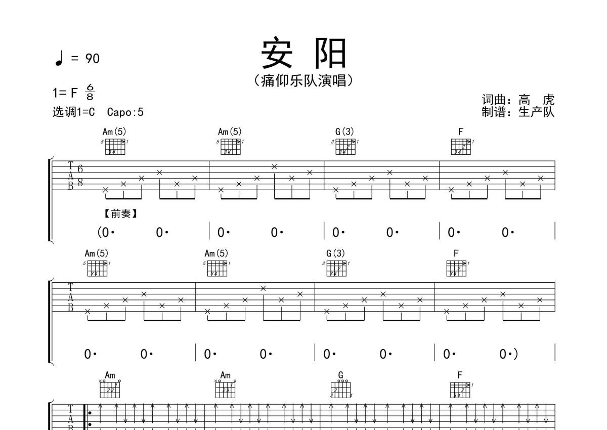 《安阳》是痛仰乐队演唱的一首歌曲,拍号为6/8拍,歌曲速度为每分钟90拍,歌曲原调为F调,但由于原调指法比较难,为了方便弹奏,本吉他谱采用的是C调指法编配,变调夹5品弹奏即为原调,当然也可以根据自己的音域改变变调夹位置,或者通过改变和弦调性,以方便自己弹奏,这份吉他谱共有三张高清图谱,图谱由 @生产队 编配上传,图谱使用六线谱编配,包含吉他和弦指法、简谱以及歌词部分,使用这份安阳吉他谱,可以让你更加方便地掌握这首歌曲的弹唱技巧,快来尝试吧。