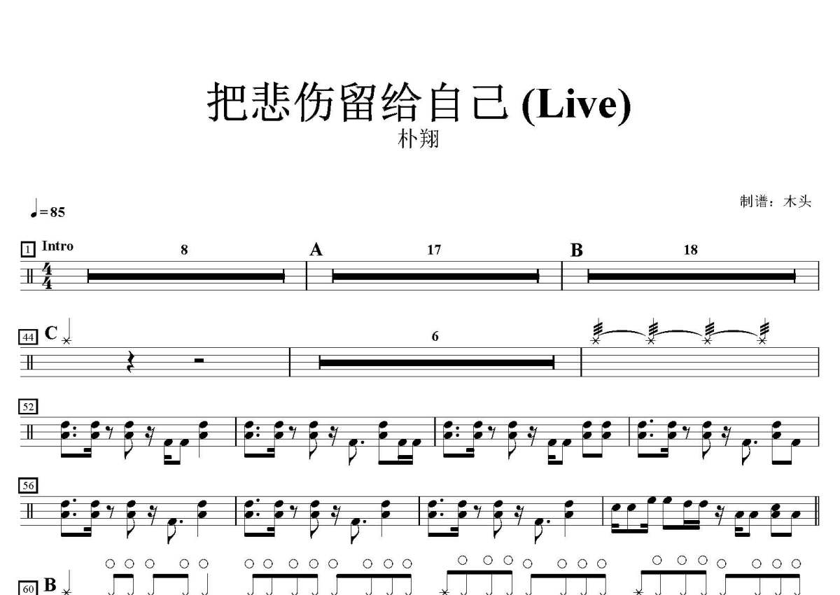 朴翔《把悲伤留给自己》鼓谱 - 架子鼓谱 - Live
