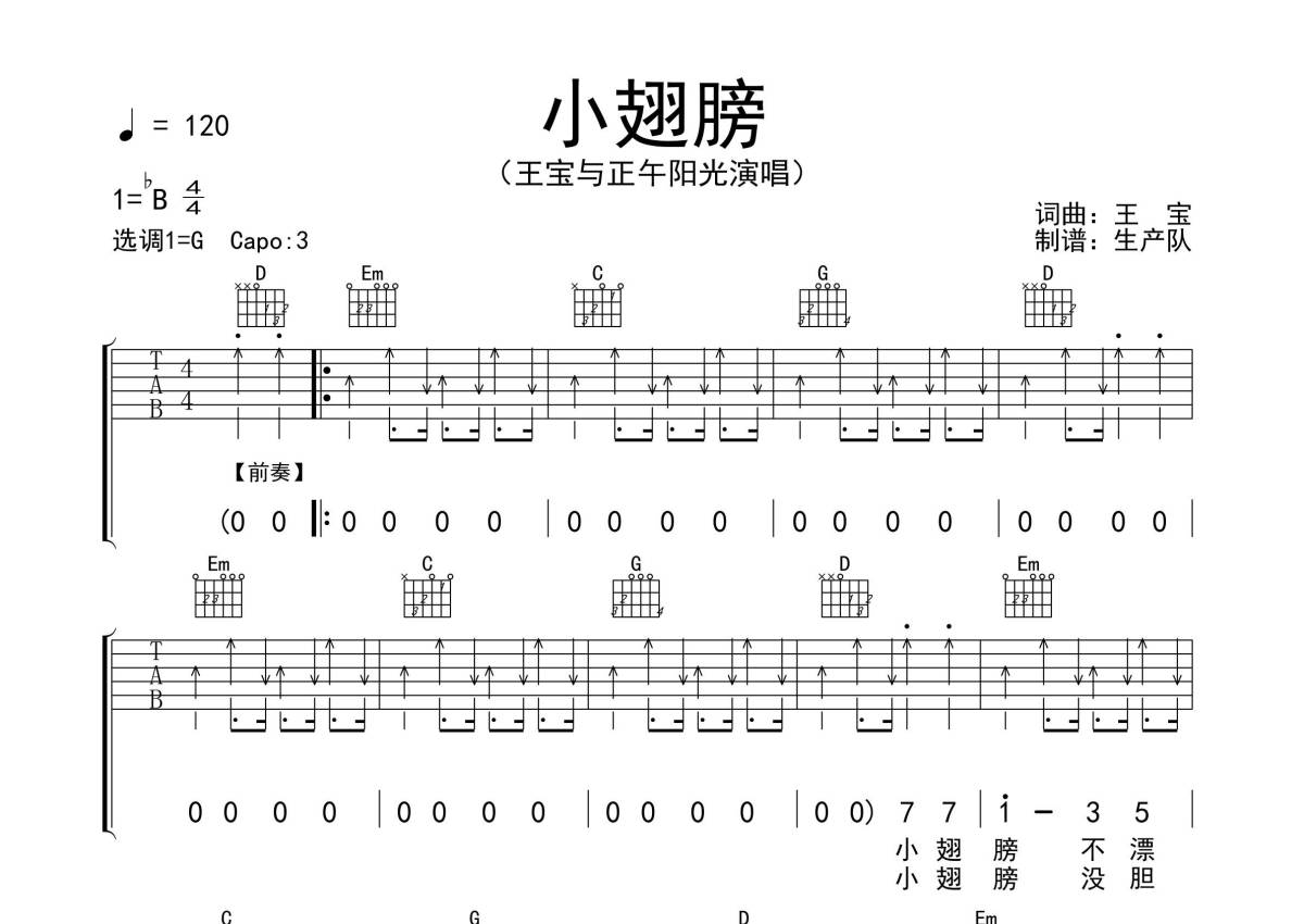 《小翅膀》是王宝/正午阳光演唱的一首歌曲,拍号为4/4拍,歌曲速度为每分钟120拍,歌曲原调为Bb调,但由于原调指法比较难,为了方便弹奏,本吉他谱采用的是G调指法编配,变调夹3品弹奏即为原调,当然也可以根据自己的音域改变变调夹位置,或者通过改变和弦调性,以方便自己弹奏,这份吉他谱共有四张高清图谱,图谱由 @生产队 编配上传,图谱使用六线谱编配,包含吉他和弦指法、简谱以及歌词部分,使用这份小翅膀吉他谱,可以让你更加方便地掌握这首歌曲的弹唱技巧,快来尝试吧。