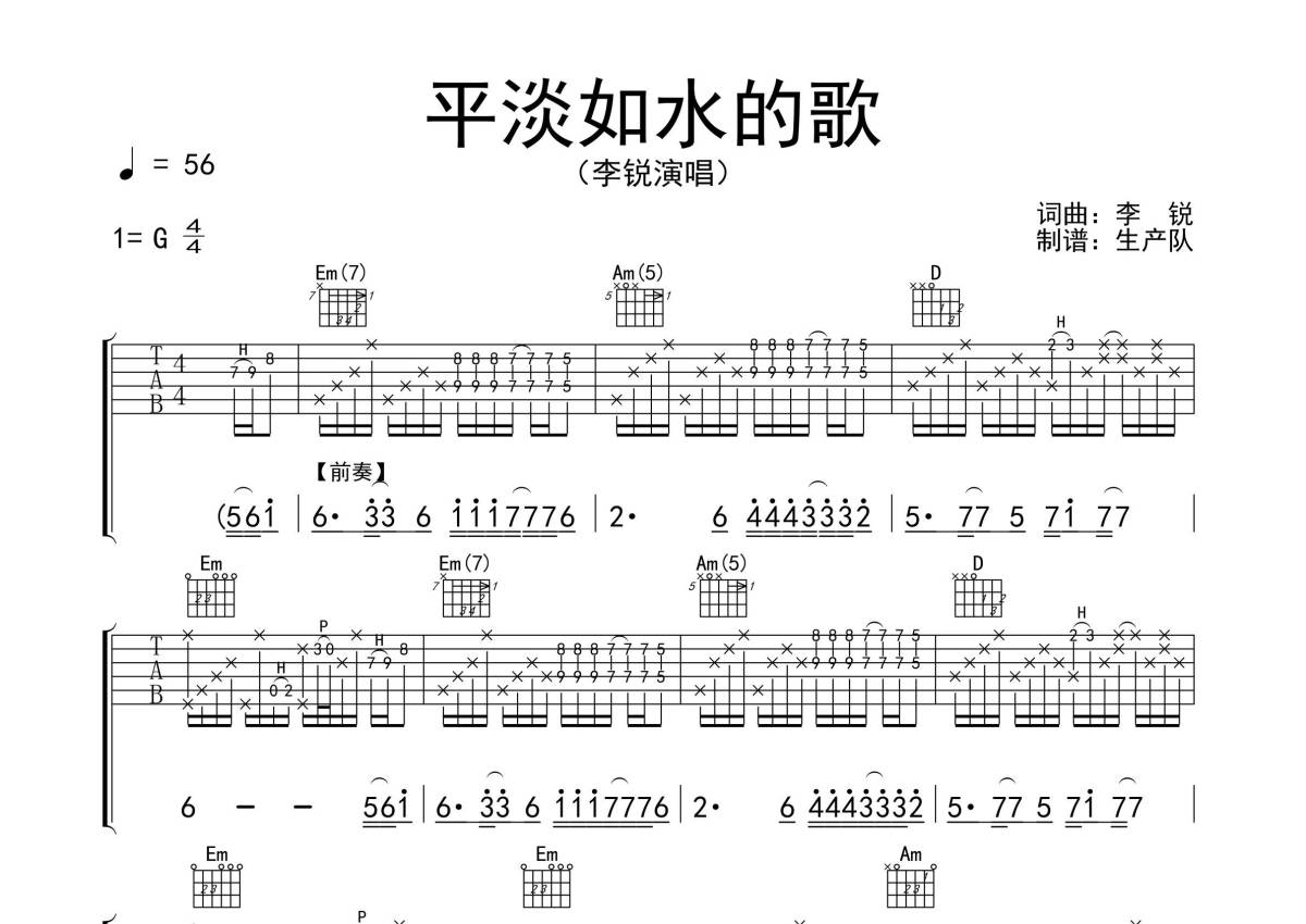 李锐《平淡如水的歌》吉他谱 - G调弹唱六线谱