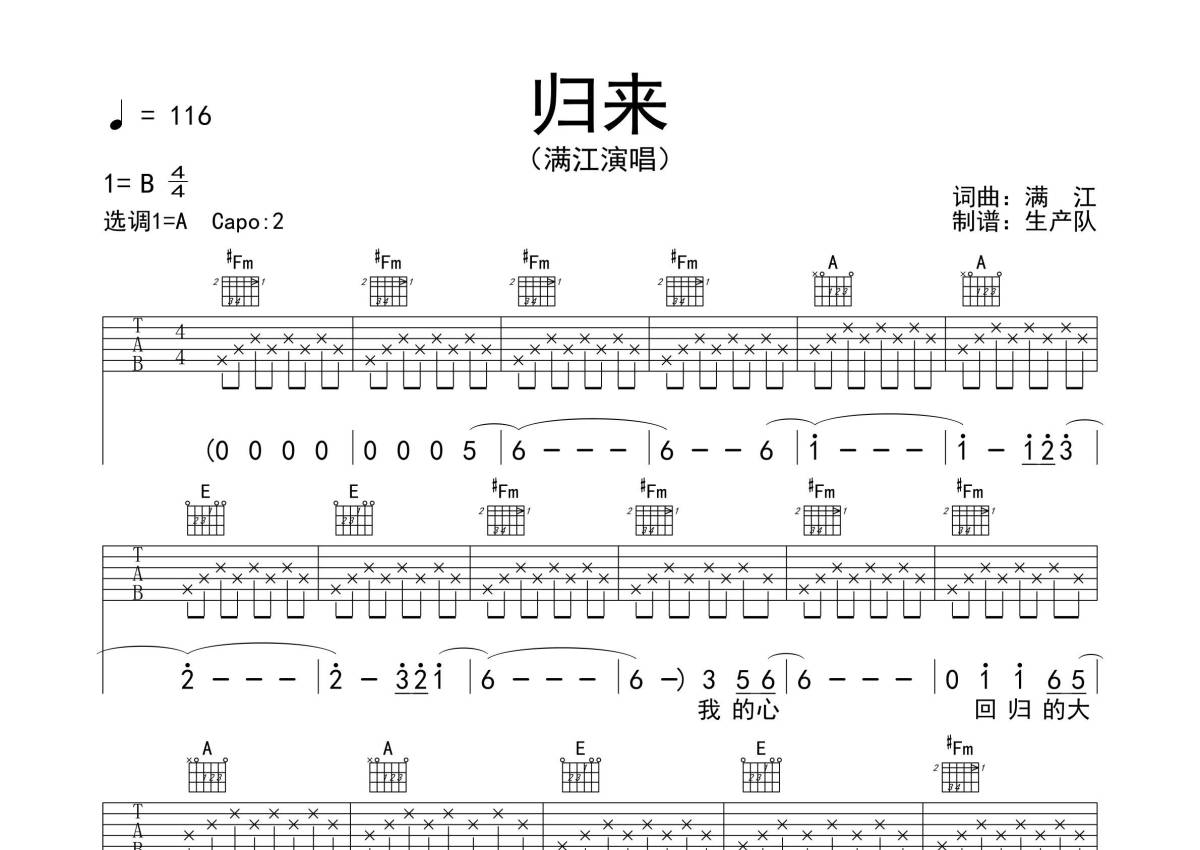 《归来》是满江演唱的一首歌曲,拍号为4/4拍,歌曲速度为每分钟116拍,歌曲原调为B调,但由于原调指法比较难,为了方便弹奏,本吉他谱采用的是A调指法编配,变调夹2品弹奏即为原调,当然也可以根据自己的音域改变变调夹位置,或者通过改变和弦调性,以方便自己弹奏,这份吉他谱共有五张高清图谱,图谱由 @生产队 编配上传,图谱使用六线谱编配,包含吉他和弦指法、简谱以及歌词部分,使用这份归来吉他谱,可以让你更加方便地掌握这首歌曲的弹唱技巧,快来尝试吧。