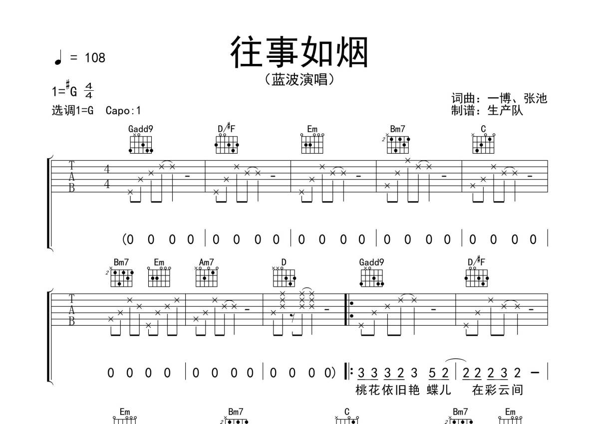 《往事如烟》是蓝波演唱的一首歌曲,拍号为4/4拍,歌曲速度为每分钟108拍,歌曲原调为Ab调,但由于原调指法比较难,为了方便弹奏,本吉他谱采用的是G调指法编配,变调夹1品弹奏即为原调,当然也可以根据自己的音域改变变调夹位置,或者通过改变和弦调性,以方便自己弹奏,这份吉他谱共有四张高清图谱,图谱由 @生产队 编配上传,图谱使用六线谱编配,包含吉他和弦指法、简谱以及歌词部分,使用这份往事如烟吉他谱,可以让你更加方便地掌握这首歌曲的弹唱技巧,快来尝试吧。