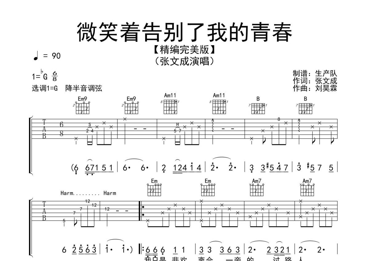 《微笑着告别了我的青春》是张文成演唱的一首歌曲,拍号为6/8拍,歌曲速度为每分钟90拍,歌曲原调为Gb调,但由于原调指法比较难,为了方便弹奏,本吉他谱采用的是G调指法编配,降半音调弦弹奏即为原调,当然也可以根据自己的音域决定是否调弦,这份吉他谱共有三张高清图谱,图谱由 @生产队 编配上传,图谱使用六线谱编配,包含吉他和弦指法、简谱以及歌词部分,使用这份微笑着告别了我的青春吉他谱,可以让你更加方便地掌握这首歌曲的弹唱技巧,快来尝试吧。