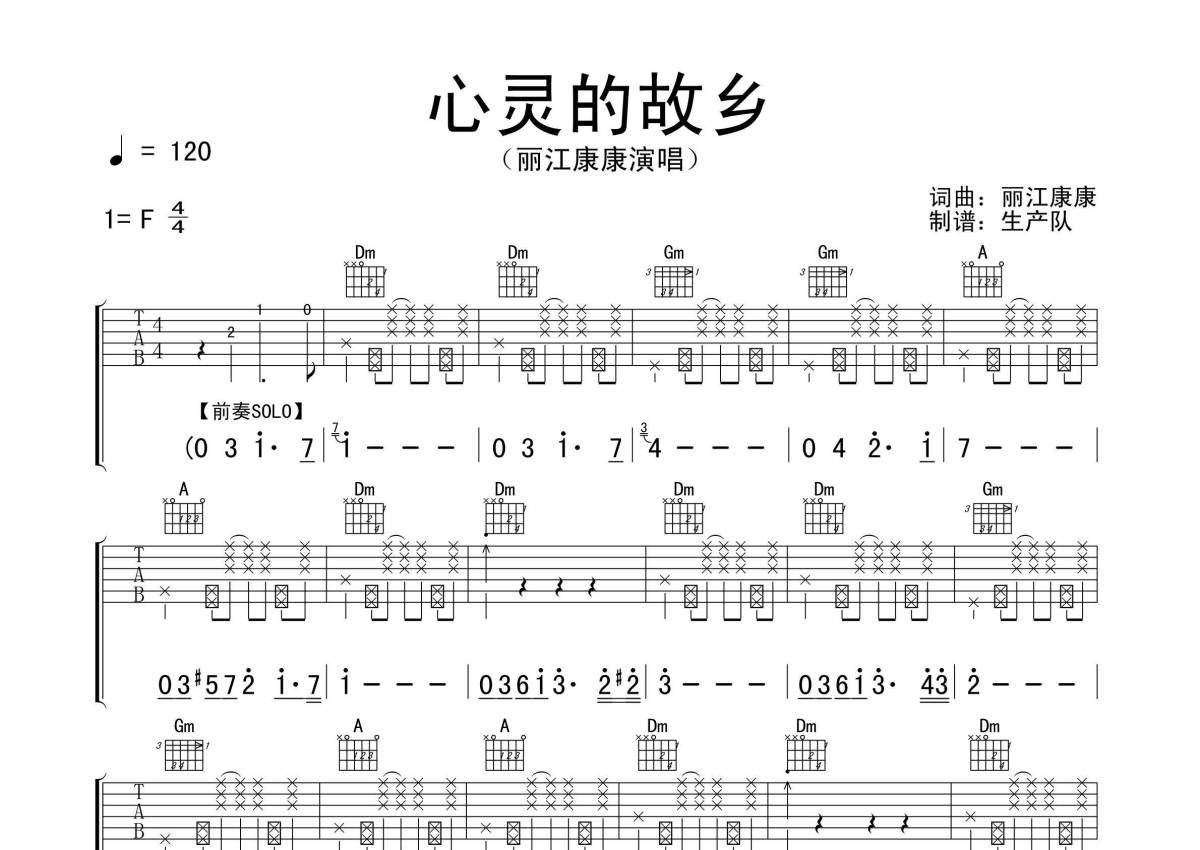 丽江康康《心灵的故乡》吉他谱 - F调弹唱六线谱