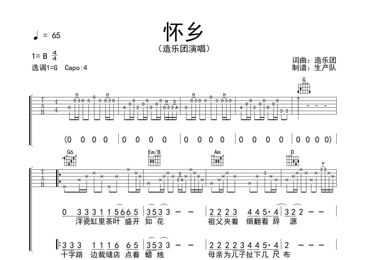 造乐团《怀乡》吉他谱 - G调弹唱六线谱