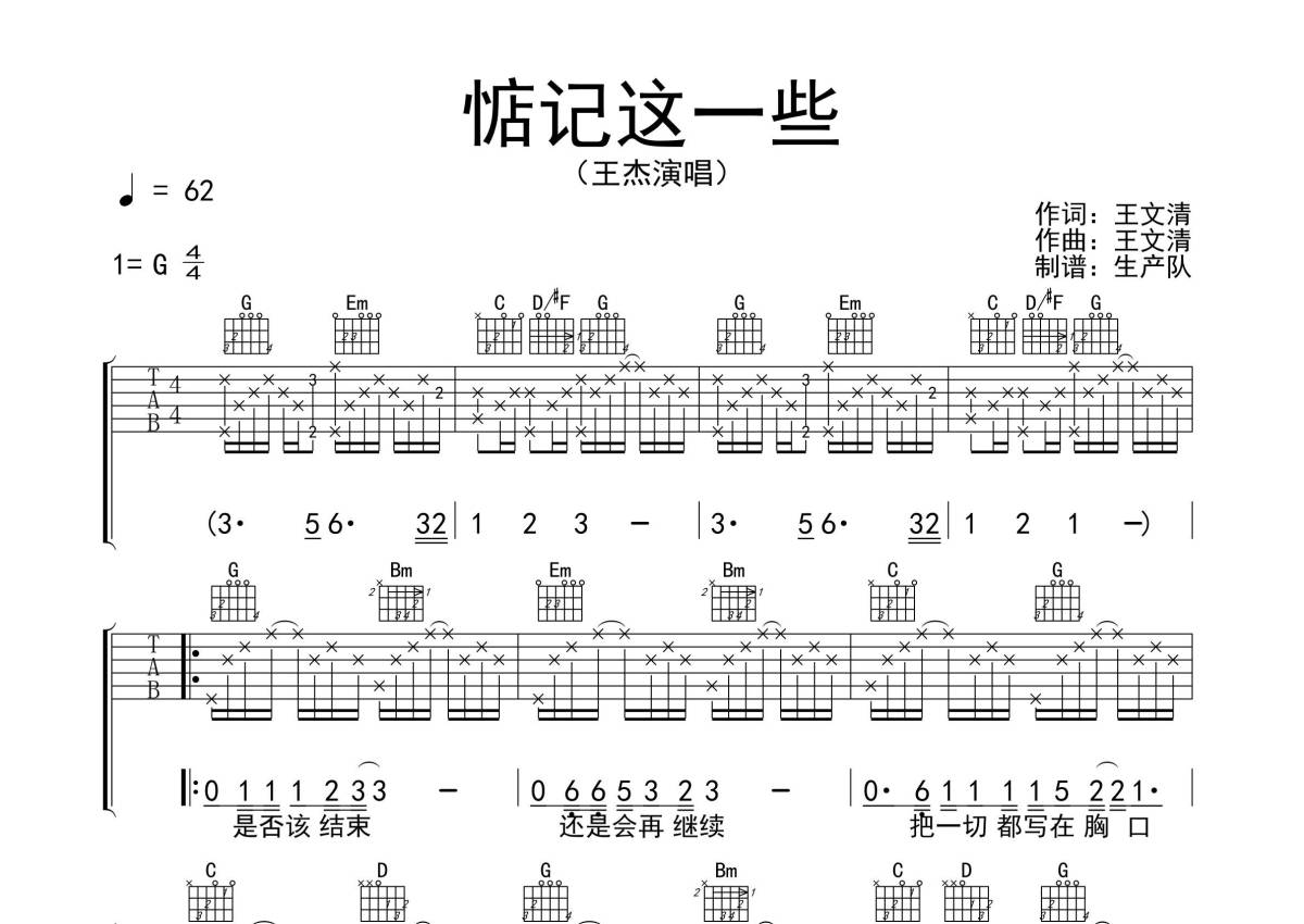 《惦记这一些》是王杰演唱的一首歌曲,拍号为4/4拍,歌曲速度为每分钟62拍,歌曲原调为G调,本吉他谱采用的是G调指法编配,演奏时不需要使用变调夹即为原调,这份吉他谱共有三张高清图谱,图谱由 @生产队 编配上传,图谱使用六线谱编配,包含吉他和弦指法、简谱以及歌词部分,使用这份惦记这一些吉他谱,可以让你更加方便地掌握这首歌曲的弹唱技巧,快来尝试吧。
