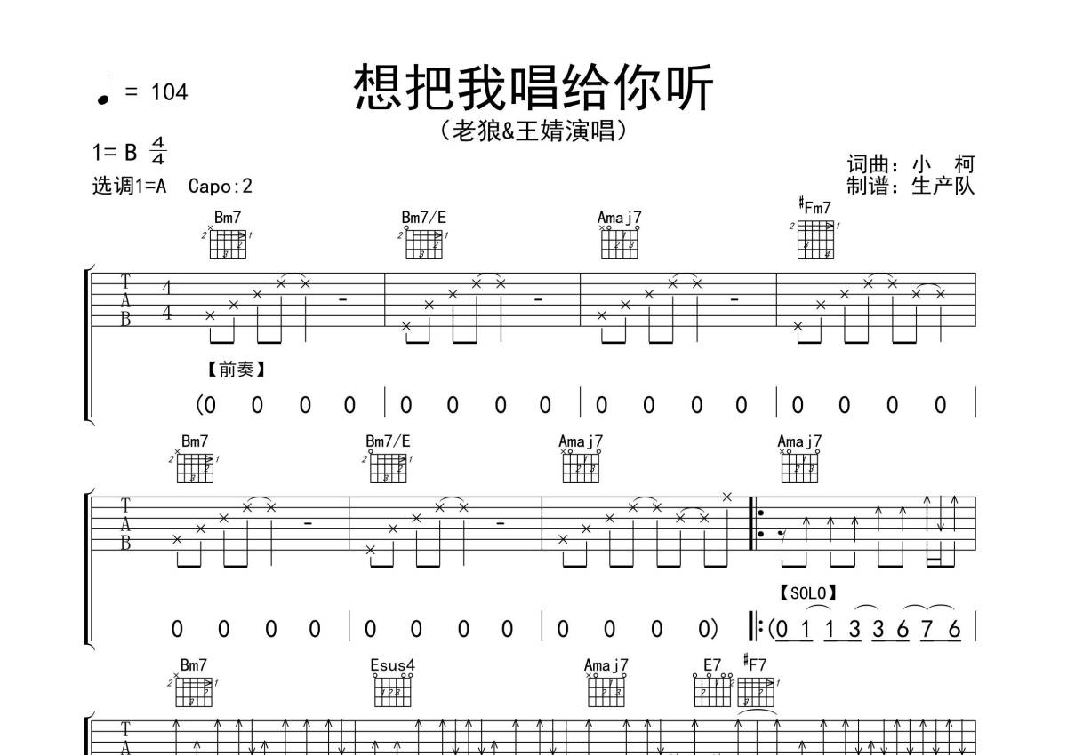 《想把我唱给你听》是老狼/王婧演唱的一首歌曲,拍号为4/4拍,歌曲速度为每分钟104拍,歌曲原调为B调,但由于原调指法比较难,为了方便弹奏,本吉他谱采用的是A调指法编配,变调夹2品弹奏即为原调,当然也可以根据自己的音域改变变调夹位置,或者通过改变和弦调性,以方便自己弹奏,这份吉他谱共有四张高清图谱,图谱由 @生产队 编配上传,图谱使用六线谱编配,包含吉他和弦指法、简谱以及歌词部分,使用这份想把我唱给你听吉他谱,可以让你更加方便地掌握这首歌曲的弹唱技巧,快来尝试吧。