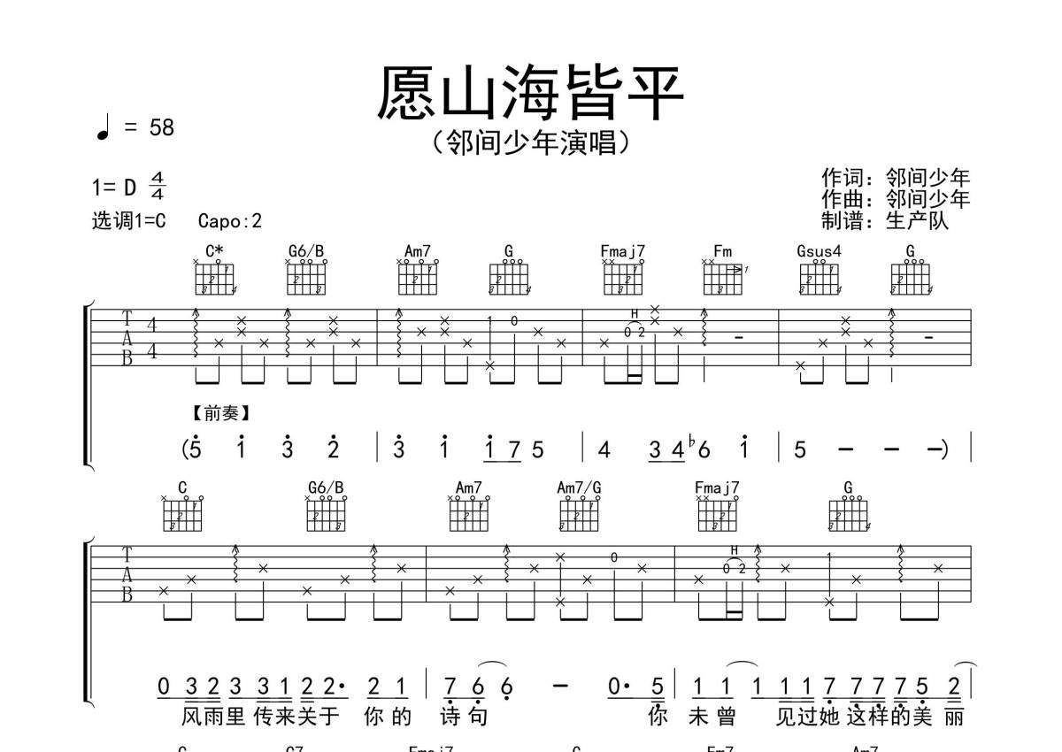 邻间少年《愿山海皆平》吉他谱 - C调弹唱六线谱
