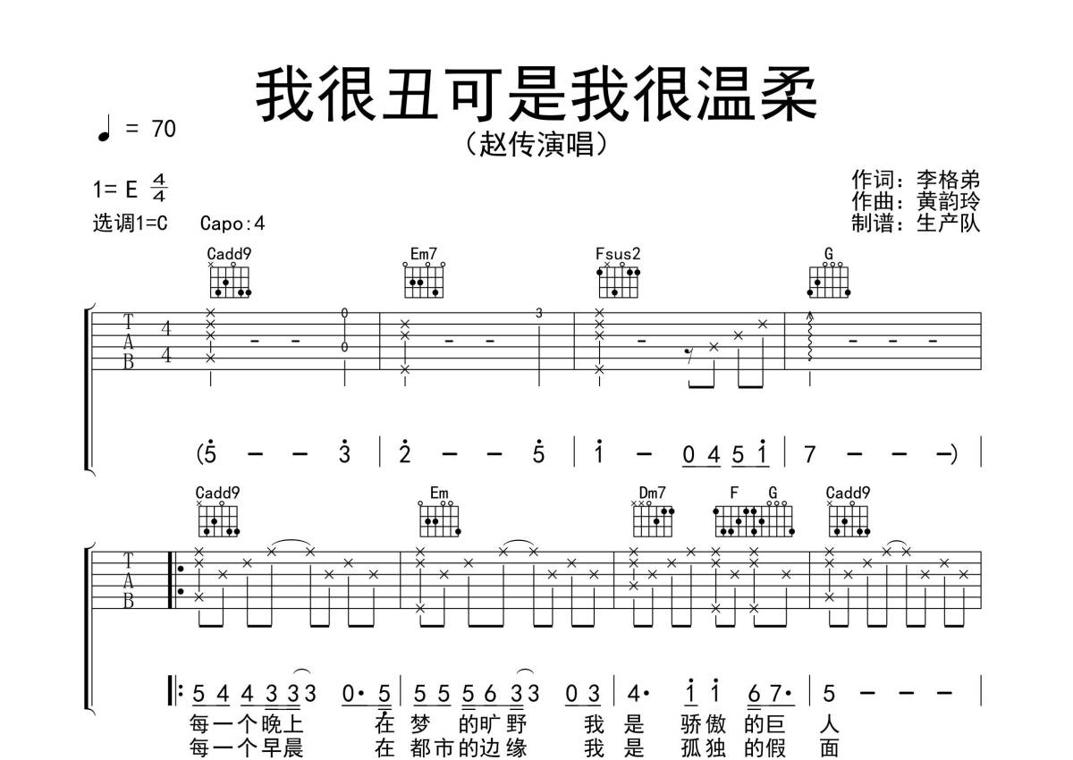 《我很丑可是我很温柔》是赵传演唱的一首歌曲,拍号为4/4拍,歌曲速度为每分钟70拍,歌曲原调为E调,但由于原调指法比较难,为了方便弹奏,本吉他谱采用的是C调指法编配,变调夹4品弹奏即为原调,当然也可以根据自己的音域改变变调夹位置,或者通过改变和弦调性,以方便自己弹奏,这份吉他谱共有三张高清图谱,图谱由 @生产队 编配上传,图谱使用六线谱编配,包含吉他和弦指法、简谱以及歌词部分,使用这份我很丑可是我很温柔吉他谱,可以让你更加方便地掌握这首歌曲的弹唱技巧,快来尝试吧。