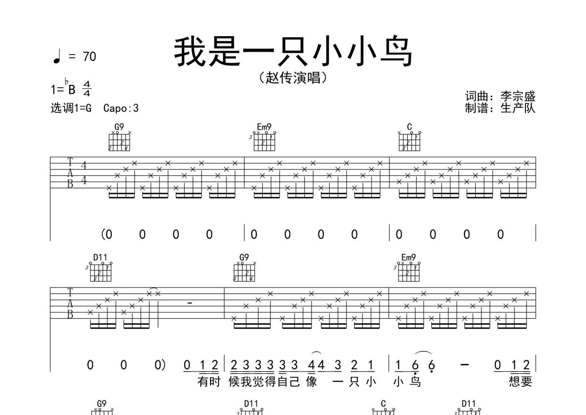 《我是一只小小鸟》是赵传演唱的一首歌曲,拍号为4/4拍,歌曲速度为每分钟70拍,歌曲原调为Bb调,但由于原调指法比较难,为了方便弹奏,本吉他谱采用的是G调指法编配,变调夹3品弹奏即为原调,当然也可以根据自己的音域改变变调夹位置,或者通过改变和弦调性,以方便自己弹奏,这份吉他谱共有四张高清图谱,图谱由 @生产队 编配上传,图谱使用六线谱编配,包含吉他和弦指法、简谱以及歌词部分,使用这份我是一只小小鸟吉他谱,可以让你更加方便地掌握这首歌曲的弹唱技巧,快来尝试吧。
