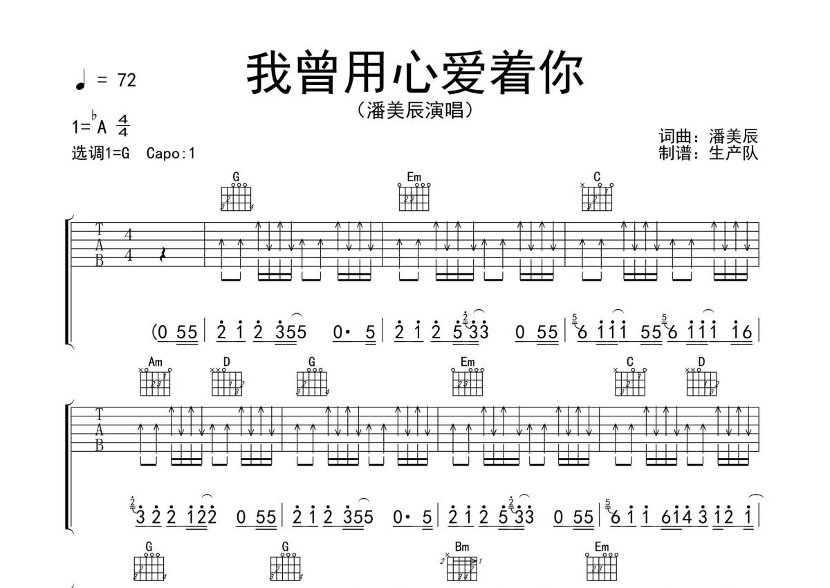 《我曾用心爱着你》是潘美辰演唱的一首歌曲,拍号为4/4拍,歌曲速度为每分钟72拍,歌曲原调为Ab调,但由于原调指法比较难,为了方便弹奏,本吉他谱采用的是G调指法编配,变调夹1品弹奏即为原调,当然也可以根据自己的音域改变变调夹位置,或者通过改变和弦调性,以方便自己弹奏,这份吉他谱共有三张高清图谱,图谱由 @生产队 编配上传,图谱使用六线谱编配,包含吉他和弦指法、简谱以及歌词部分,使用这份我曾用心爱着你吉他谱,可以让你更加方便地掌握这首歌曲的弹唱技巧,快来尝试吧。