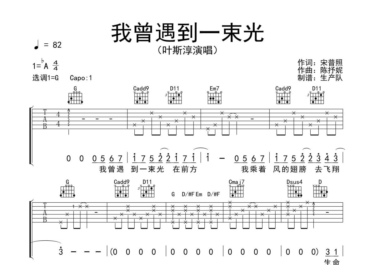 叶斯淳《我曾遇到一束光》吉他谱 - G调弹唱六线谱