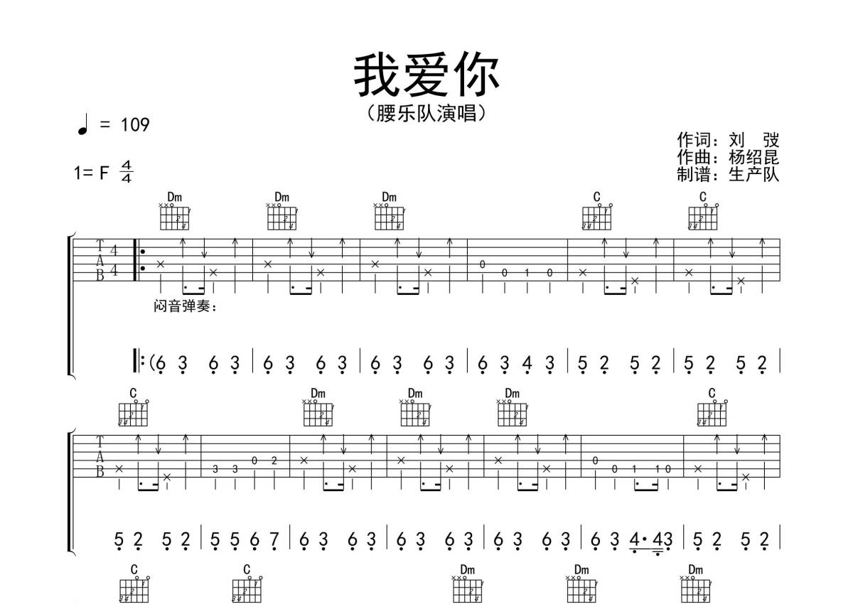 腰乐队《我爱你》吉他谱 - F调弹唱六线谱