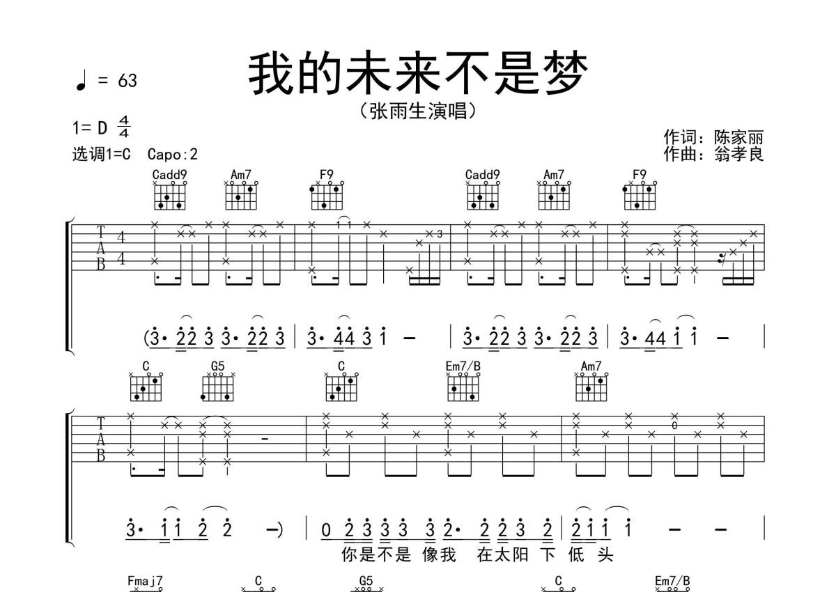 《我的未来不是梦》是张雨生演唱的一首歌曲,拍号为4/4拍,歌曲速度为每分钟63拍,歌曲原调为D调,但由于原调指法比较难,为了方便弹奏,本吉他谱采用的是C调指法编配,变调夹2品弹奏即为原调,当然也可以根据自己的音域改变变调夹位置,或者通过改变和弦调性,以方便自己弹奏,这份吉他谱共有四张高清图谱,图谱由 @生产队 编配上传,图谱使用六线谱编配,包含吉他和弦指法、简谱以及歌词部分,使用这份我的未来不是梦吉他谱,可以让你更加方便地掌握这首歌曲的弹唱技巧,快来尝试吧。