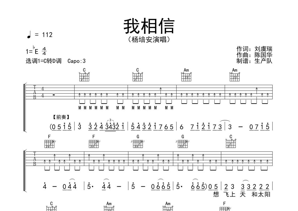 《我相信》是杨培安演唱的一首歌曲,拍号为4/4拍,歌曲速度为每分钟112拍,歌曲原调为Eb调,但由于原调指法比较难,为了方便弹奏,本吉他谱采用的是C调指法编配,变调夹3品弹奏即为原调,当然也可以根据自己的音域改变变调夹位置,或者通过改变和弦调性,以方便自己弹奏,这份吉他谱共有四张高清图谱,图谱由 @生产队 编配上传,图谱使用六线谱编配,包含吉他和弦指法、简谱以及歌词部分,使用这份我相信吉他谱,可以让你更加方便地掌握这首歌曲的弹唱技巧,快来尝试吧。