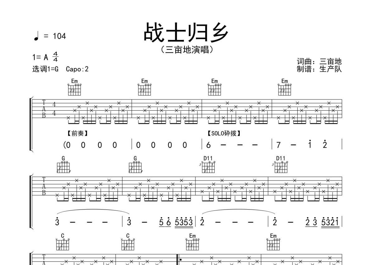 三亩地《战士归乡》吉他谱 - G调弹唱六线谱