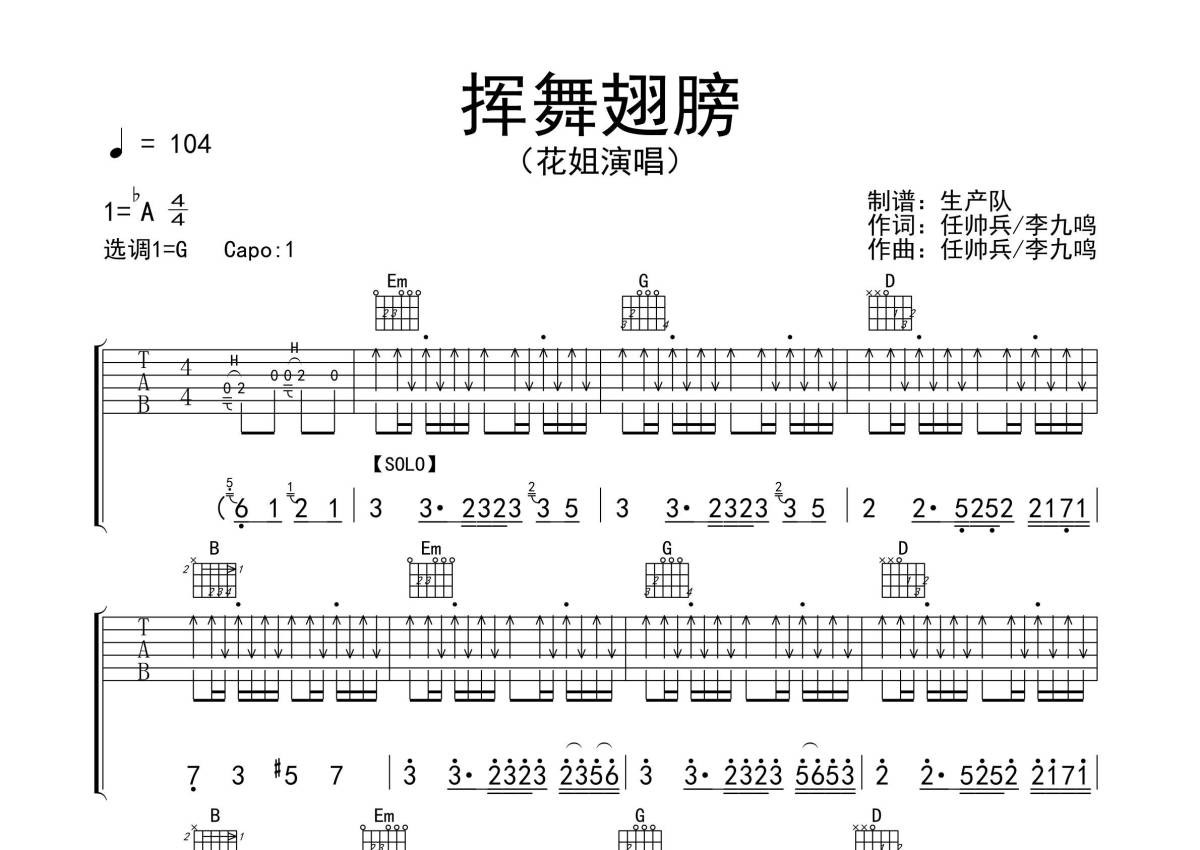 《挥舞翅膀》是花姐演唱的一首歌曲,拍号为4/4拍,歌曲速度为每分钟104拍,歌曲原调为Ab调,但由于原调指法比较难,为了方便弹奏,本吉他谱采用的是G调指法编配,变调夹1品弹奏即为原调,当然也可以根据自己的音域改变变调夹位置,或者通过改变和弦调性,以方便自己弹奏,这份吉他谱共有三张高清图谱,图谱由 @生产队 编配上传,图谱使用六线谱编配,包含吉他和弦指法、简谱以及歌词部分,使用这份挥舞翅膀吉他谱,可以让你更加方便地掌握这首歌曲的弹唱技巧,快来尝试吧。