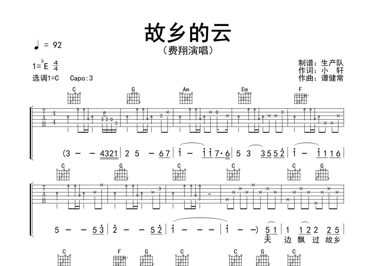 《故乡的云》是费翔演唱的一首歌曲,拍号为4/4拍,歌曲速度为每分钟92拍,歌曲原调为Eb调,但由于原调指法比较难,为了方便弹奏,本吉他谱采用的是C调指法编配,变调夹3品弹奏即为原调,当然也可以根据自己的音域改变变调夹位置,或者通过改变和弦调性,以方便自己弹奏,这份吉他谱共有三张高清图谱,图谱由 @生产队 编配上传,图谱使用六线谱编配,包含吉他和弦指法、简谱以及歌词部分,使用这份故乡的云吉他谱,可以让你更加方便地掌握这首歌曲的弹唱技巧,快来尝试吧。