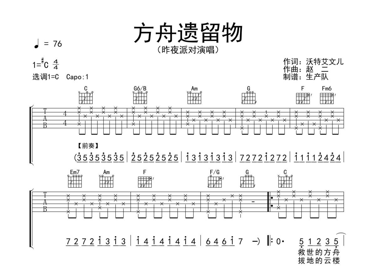 昨夜派对《方舟遗留物》吉他谱 - C调弹唱六线谱