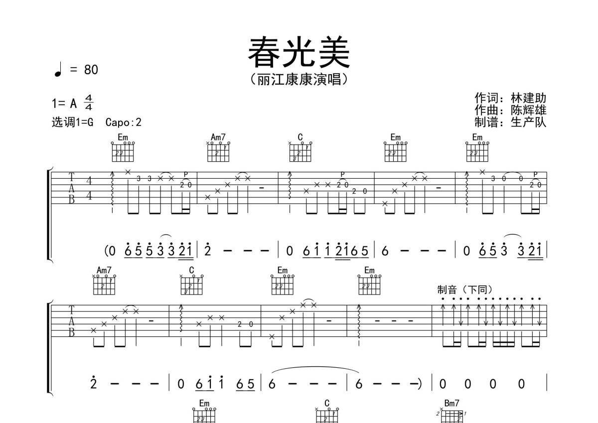 《春光美》是丽江康康演唱的一首歌曲,拍号为4/4拍,歌曲速度为每分钟80拍,歌曲原调为A调,但由于原调指法比较难,为了方便弹奏,本吉他谱采用的是G调指法编配,变调夹2品弹奏即为原调,当然也可以根据自己的音域改变变调夹位置,或者通过改变和弦调性,以方便自己弹奏,这份吉他谱共有三张高清图谱,图谱由 @生产队 编配上传,图谱使用六线谱编配,包含吉他和弦指法、简谱以及歌词部分,使用这份春光美吉他谱,可以让你更加方便地掌握这首歌曲的弹唱技巧,快来尝试吧。
