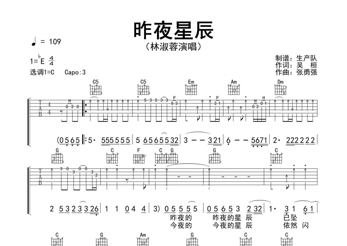 《昨夜星辰》是林淑蓉演唱的一首歌曲,拍号为4/4拍,歌曲速度为每分钟109拍,歌曲原调为Eb调,但由于原调指法比较难,为了方便弹奏,本吉他谱采用的是C调指法编配,变调夹3品弹奏即为原调,当然也可以根据自己的音域改变变调夹位置,或者通过改变和弦调性,以方便自己弹奏,这份吉他谱共有两张高清图谱,图谱由 @生产队 编配上传,图谱使用六线谱编配,包含吉他和弦指法、简谱以及歌词部分,使用这份昨夜星辰吉他谱,可以让你更加方便地掌握这首歌曲的弹唱技巧,快来尝试吧。