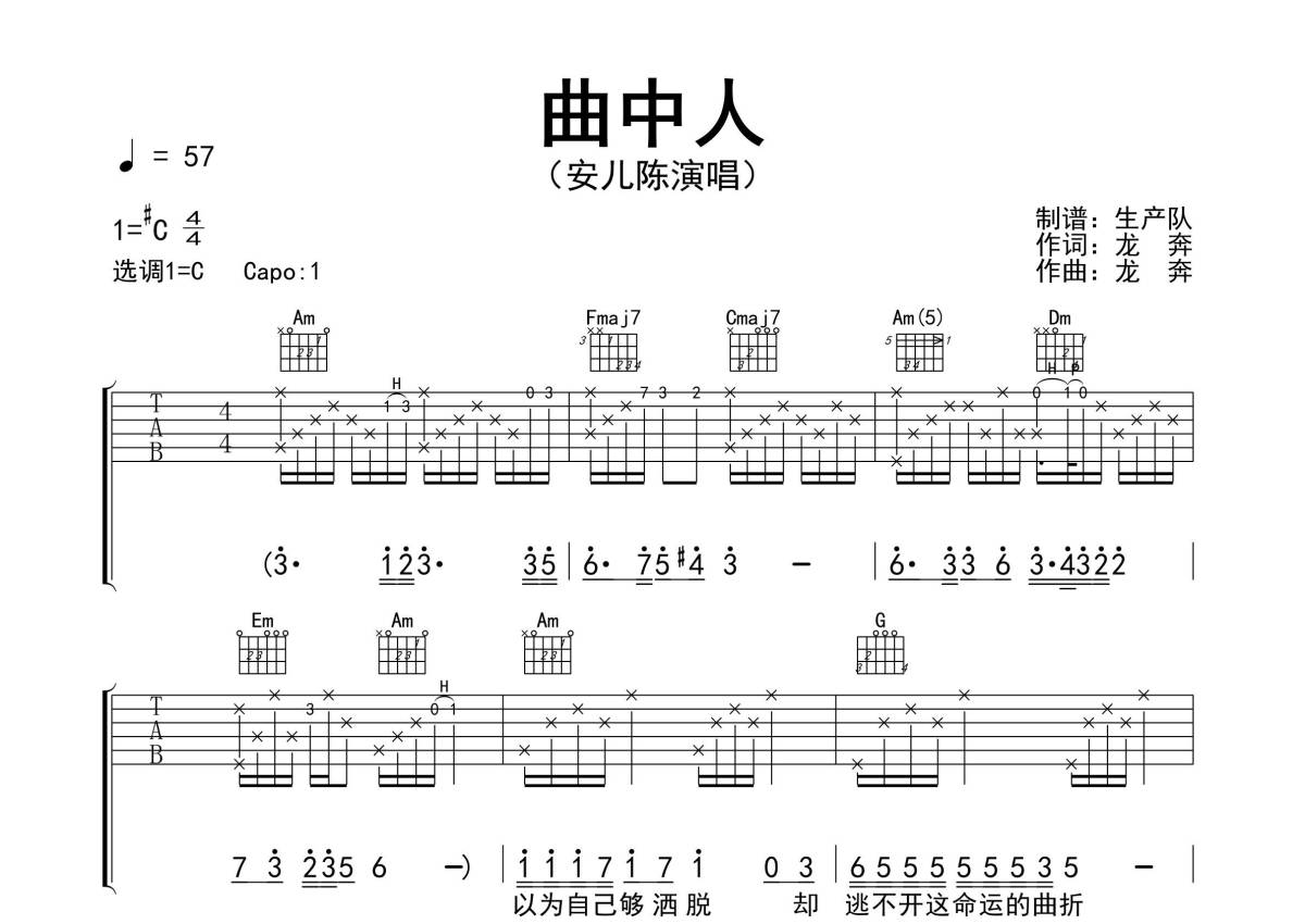 《曲中人》是安儿陈演唱的一首歌曲,拍号为4/4拍,歌曲速度为每分钟57拍,歌曲原调为Db调,但由于原调指法比较难,为了方便弹奏,本吉他谱采用的是C调指法编配,变调夹1品弹奏即为原调,当然也可以根据自己的音域改变变调夹位置,或者通过改变和弦调性,以方便自己弹奏,这份吉他谱共有三张高清图谱,图谱由 @生产队 编配上传,图谱使用六线谱编配,包含吉他和弦指法、简谱以及歌词部分,使用这份曲中人吉他谱,可以让你更加方便地掌握这首歌曲的弹唱技巧,快来尝试吧。