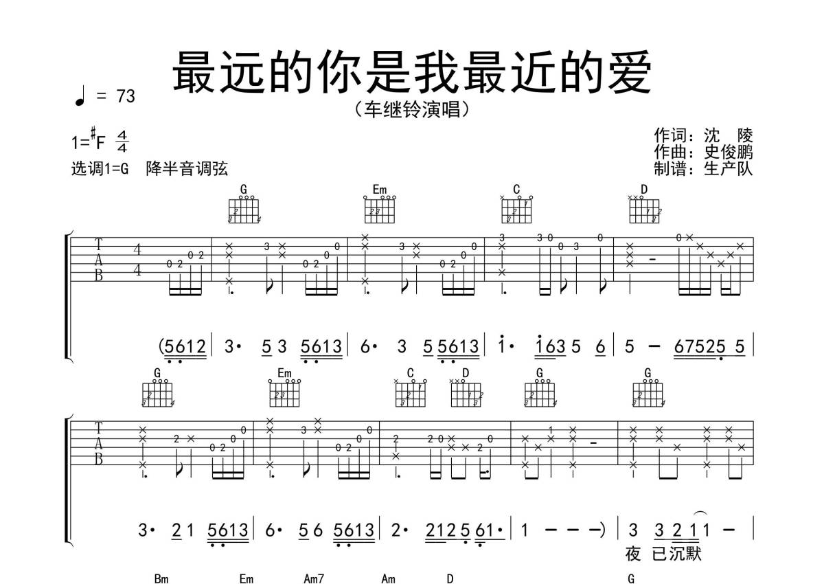 《最远的你是我最近的爱》是车继铃演唱的一首歌曲,拍号为4/4拍,歌曲速度为每分钟73拍,歌曲原调为Gb调,但由于原调指法比较难,为了方便弹奏,本吉他谱采用的是G调指法编配,降半音调弦弹奏即为原调,当然也可以根据自己的音域决定是否调弦,这份吉他谱共有四张高清图谱,图谱由 @生产队 编配上传,图谱使用六线谱编配,包含吉他和弦指法、简谱以及歌词部分,使用这份最远的你是我最近的爱吉他谱,可以让你更加方便地掌握这首歌曲的弹唱技巧,快来尝试吧。