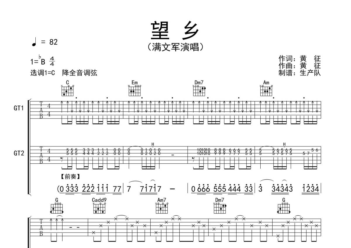 《望乡》是满文军演唱的一首歌曲,拍号为4/4拍,歌曲速度为每分钟82拍,歌曲原调为Bb调,但由于原调指法比较难,为了方便弹奏,本吉他谱采用的是C调指法编配,这份吉他谱共有三张高清图谱,图谱由 @生产队 编配上传,图谱使用六线谱编配,包含吉他和弦指法、简谱以及歌词部分,使用这份望乡吉他谱,可以让你更加方便地掌握这首歌曲的弹唱技巧,快来尝试吧。降全音调弦为原调。