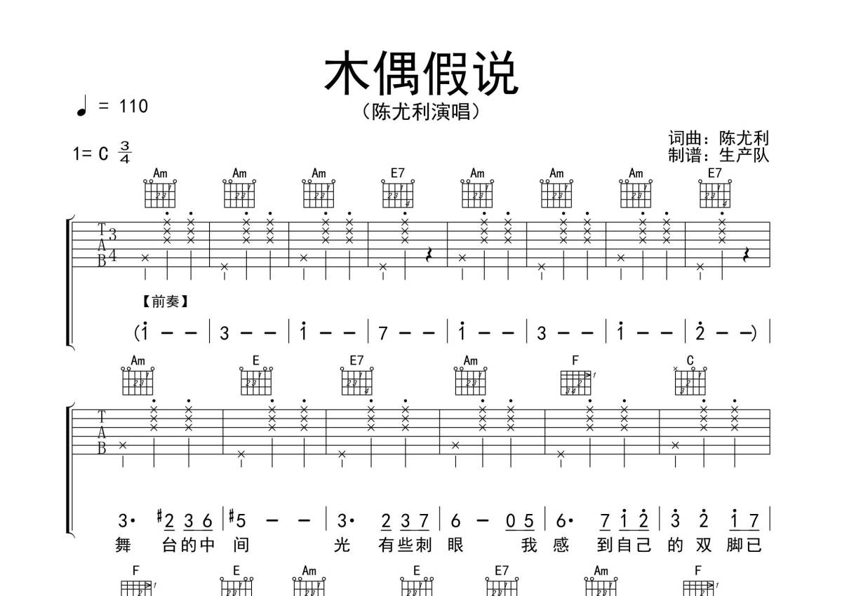 《木偶假说》是陈尤利演唱的一首歌曲,拍号为3/4拍,歌曲速度为每分钟110拍,歌曲原调为C调,本吉他谱采用的是C调指法编配,演奏时不需要使用变调夹即为原调,这份吉他谱共有四张高清图谱,图谱由 @生产队 编配上传,图谱使用六线谱编配,包含吉他和弦指法、简谱以及歌词部分,使用这份木偶假说吉他谱,可以让你更加方便地掌握这首歌曲的弹唱技巧,快来尝试吧。