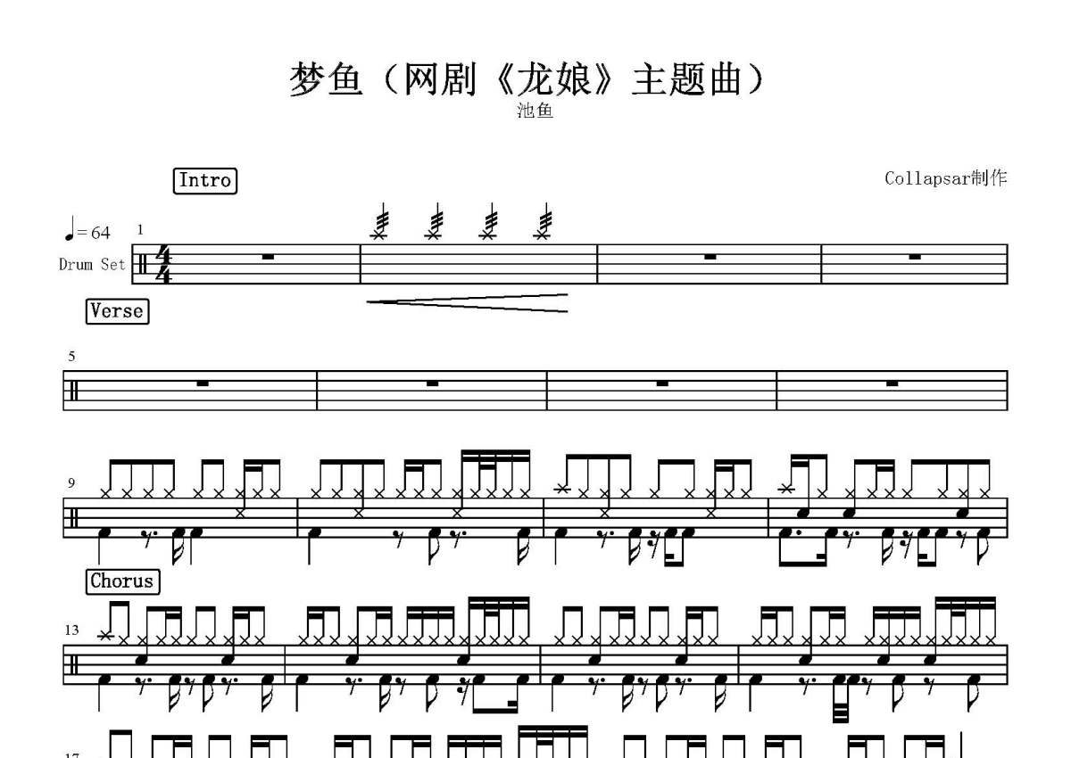 《梦鱼》是池鱼演唱的一首歌曲,这份鼓谱共有两张高清图谱,图谱由 @打鼓谱 编配上传,图谱使用五线谱编配,使用这份梦鱼架子鼓谱,你将能够轻松地敲打出这首池鱼的梦鱼,快来尝试吧。网剧《龙娘》主题曲。