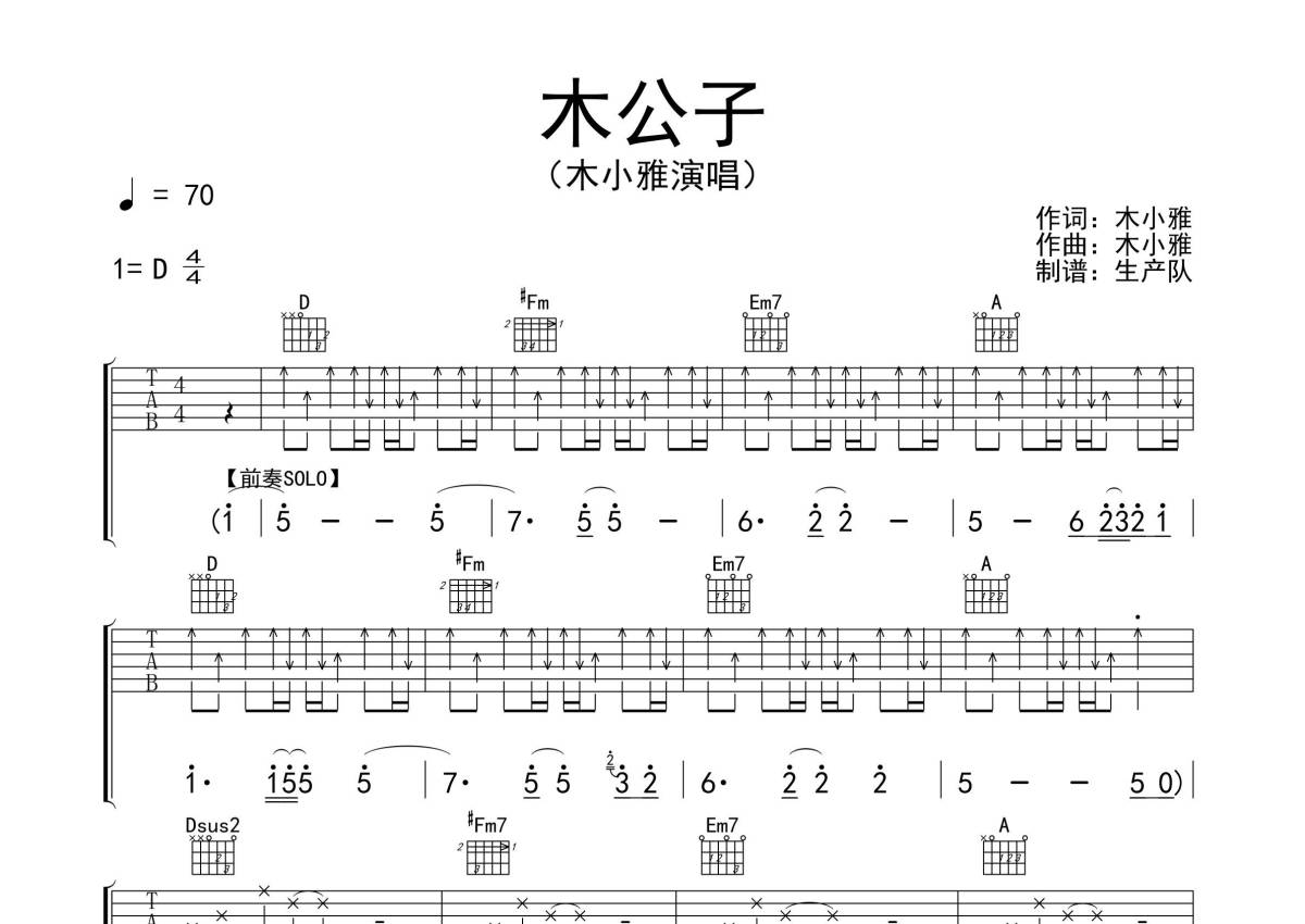 木小雅《木公子》吉他谱 - D调弹唱六线谱