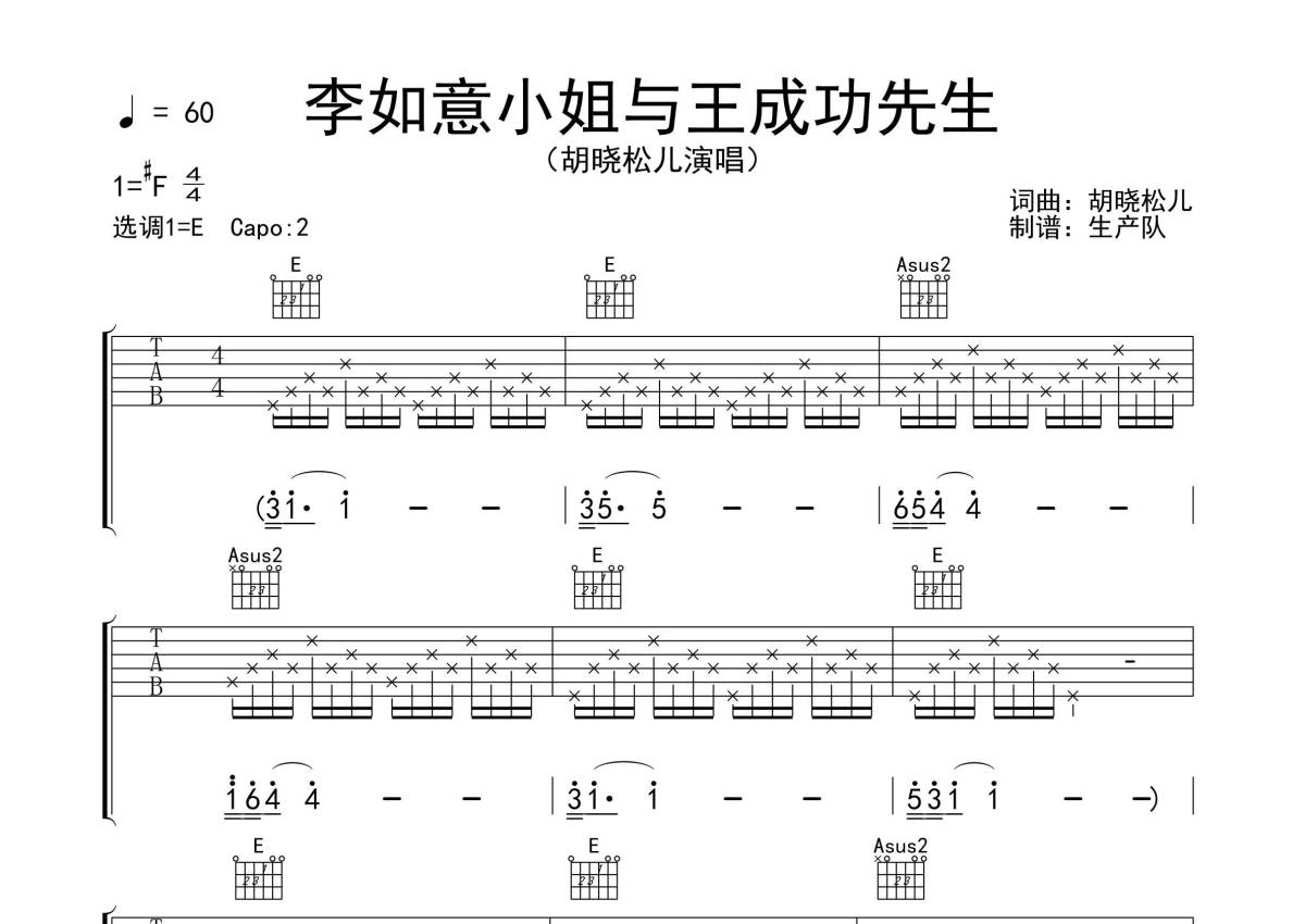 胡晓松儿《李如意小姐与王成功先生》吉他谱 - E调弹唱六线谱