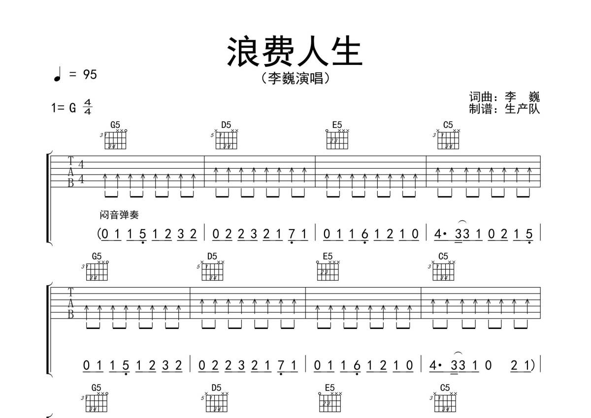 李巍《浪费人生》吉他谱 - G调弹唱六线谱