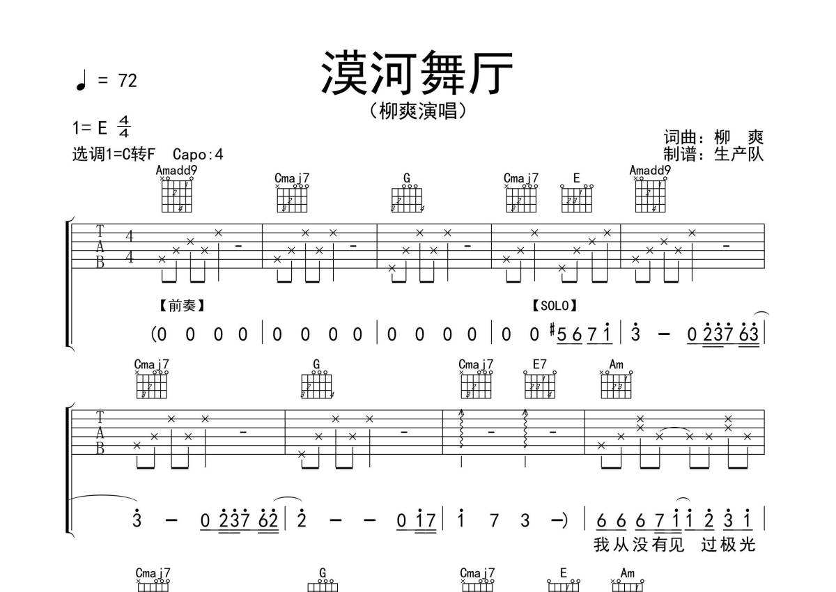 《漠河舞厅》是柳爽演唱的一首歌曲,拍号为4/4拍,歌曲速度为每分钟72拍,歌曲原调为E调,但由于原调指法比较难,为了方便弹奏,本吉他谱采用的是C调指法编配,变调夹4品弹奏即为原调,当然也可以根据自己的音域改变变调夹位置,或者通过改变和弦调性,以方便自己弹奏,这份吉他谱共有五张高清图谱,图谱由 @生产队 编配上传,图谱使用六线谱编配,包含吉他和弦指法、简谱以及歌词部分,使用这份漠河舞厅吉他谱,可以让你更加方便地掌握这首歌曲的弹唱技巧,快来尝试吧。