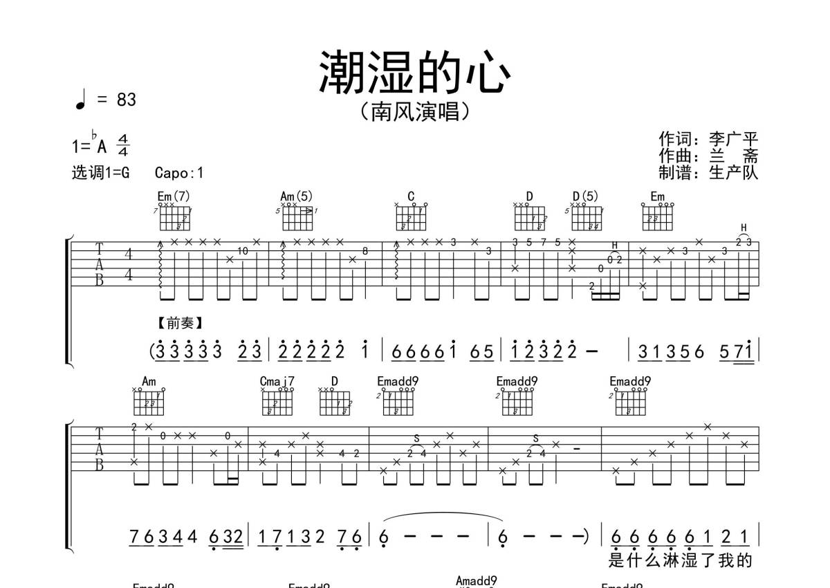 《潮湿的心》是南风演唱的一首歌曲,拍号为4/4拍,歌曲速度为每分钟83拍,歌曲原调为Ab调,但由于原调指法比较难,为了方便弹奏,本吉他谱采用的是G调指法编配,变调夹1品弹奏即为原调,当然也可以根据自己的音域改变变调夹位置,或者通过改变和弦调性,以方便自己弹奏,这份吉他谱共有三张高清图谱,图谱由 @生产队 编配上传,图谱使用六线谱编配,包含吉他和弦指法、简谱以及歌词部分,使用这份潮湿的心吉他谱,可以让你更加方便地掌握这首歌曲的弹唱技巧,快来尝试吧。