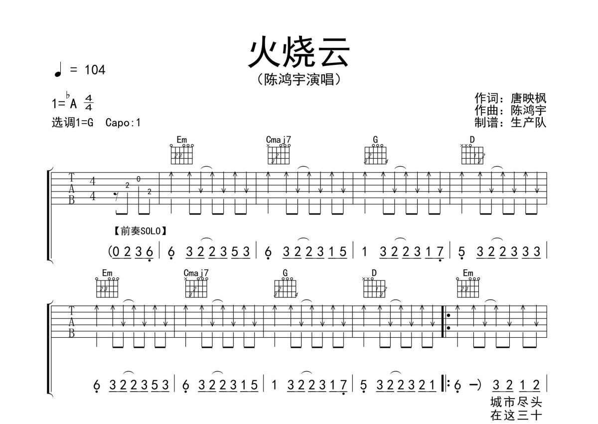 陈鸿宇《火烧云》吉他谱 - G调弹唱六线谱