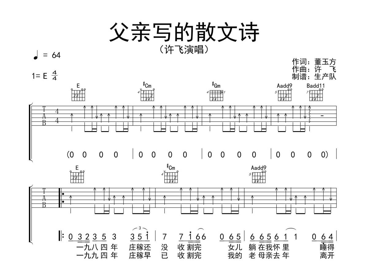 许飞《父亲写的散文诗》吉他谱 - E调弹唱六线谱