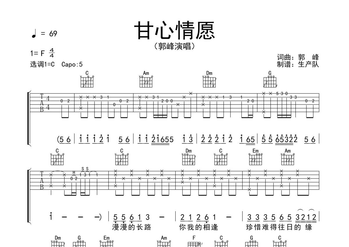 郭峰《甘心情愿》吉他谱 - C调弹唱六线谱