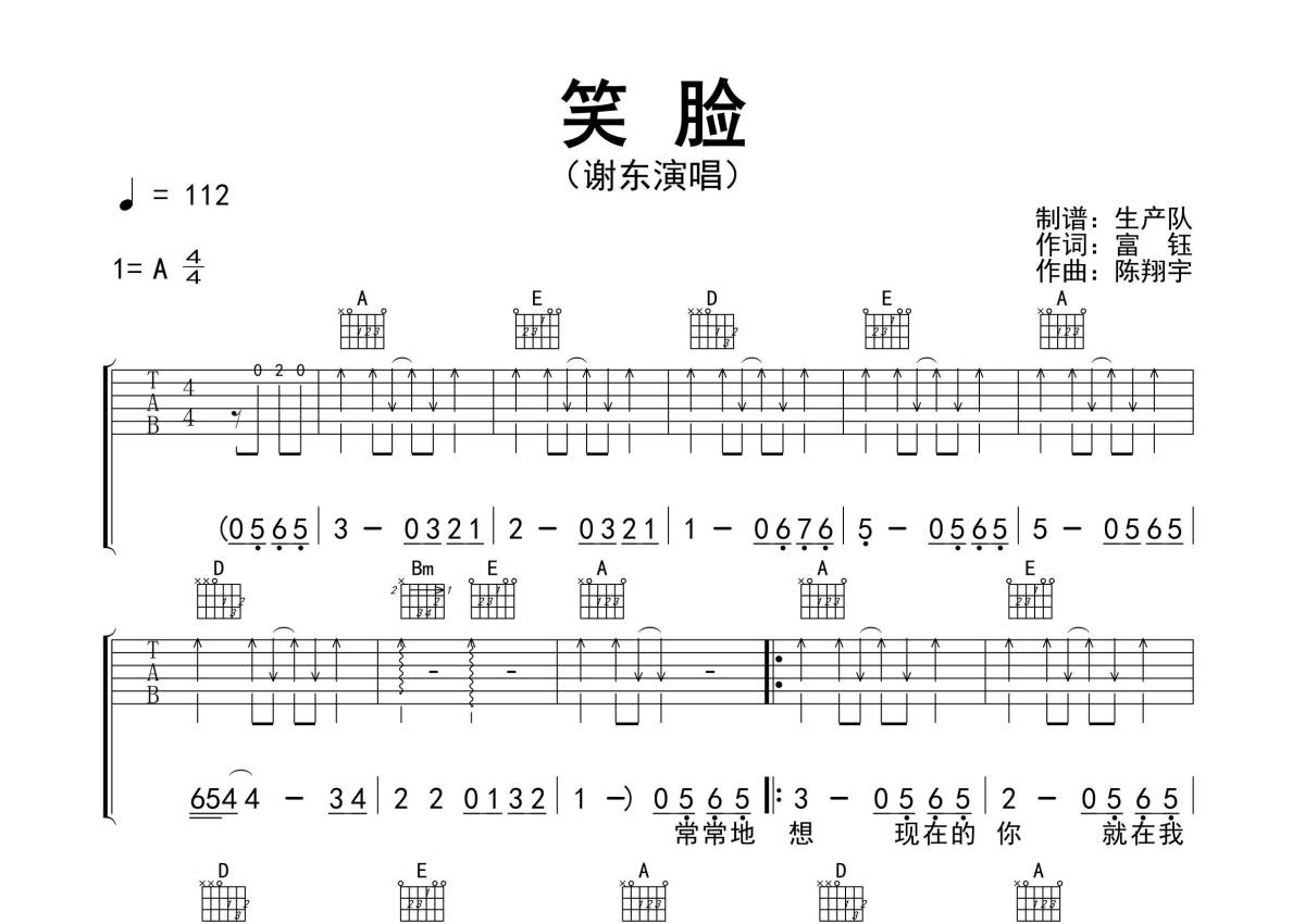 谢东《笑脸》吉他谱 - A调弹唱六线谱