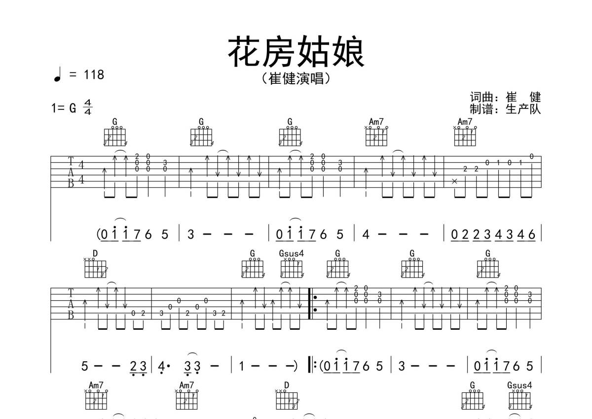 《花房姑娘》是崔健演唱的一首歌曲,抖音版,拍号为4/4拍,歌曲速度为每分钟118拍,歌曲原调为G调,本吉他谱采用的是G调指法编配,演奏时不需要使用变调夹即为原调,这份吉他谱共有三张高清图谱,图谱由 @生产队 编配上传,图谱使用六线谱编配,包含吉他和弦指法、简谱以及歌词部分,使用这份花房姑娘吉他谱,可以让你更加方便地掌握这首歌曲的弹唱技巧,快来尝试吧。