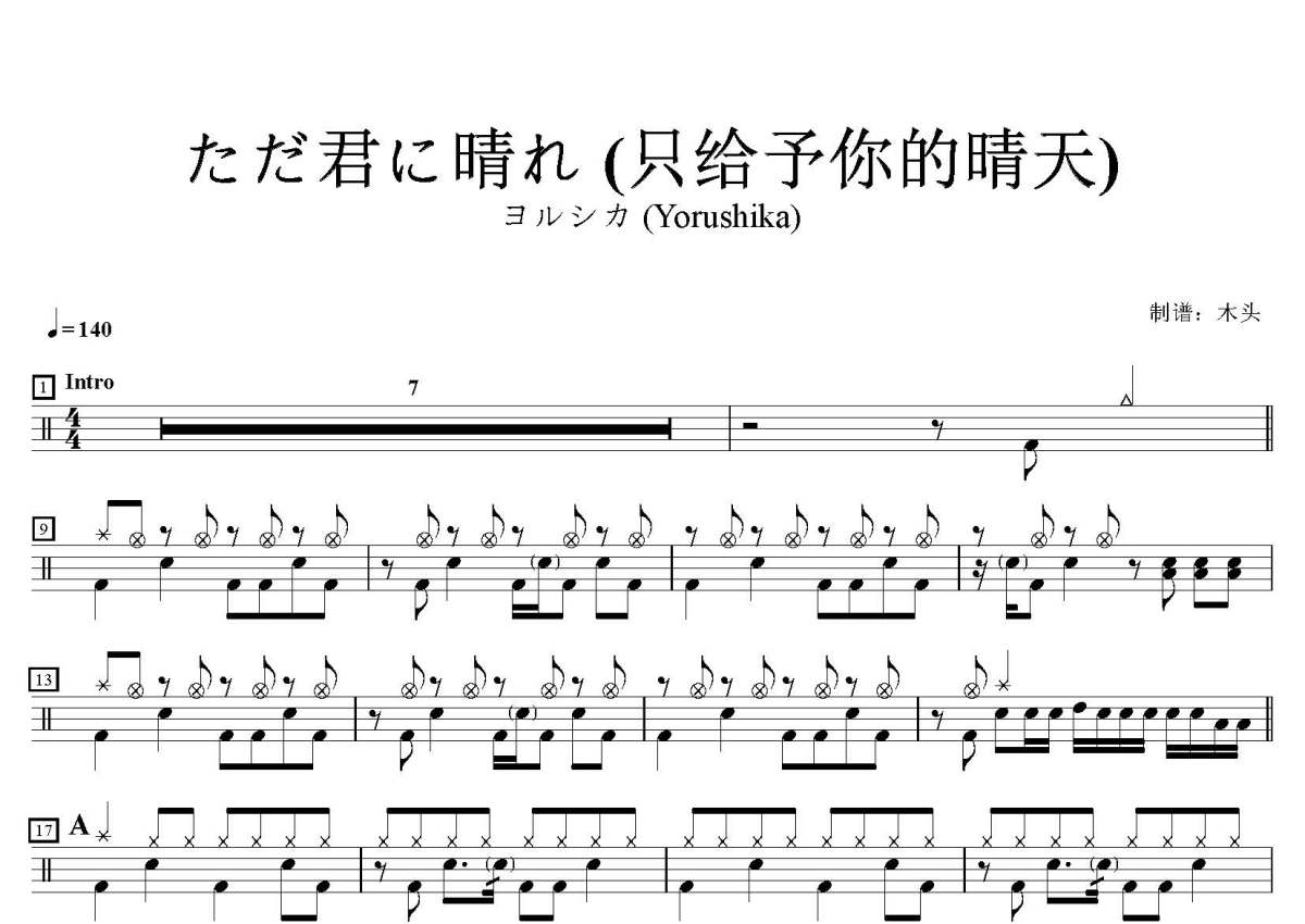 ヨルシカ (Yorushika)《ただ君に晴れ》鼓谱 - 架子鼓谱