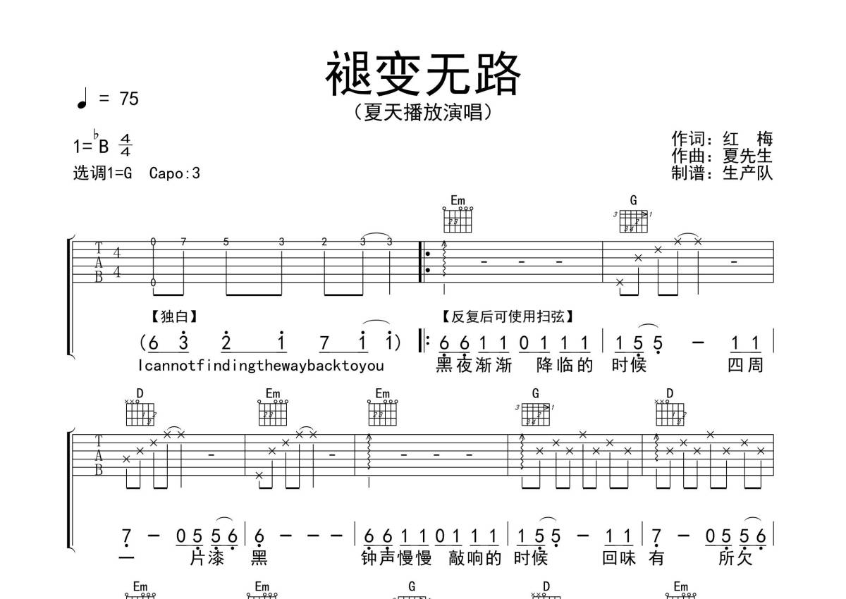 《褪变无路》是夏天播放演唱的一首歌曲,拍号为4/4拍,歌曲原调为Bb调,但由于原调指法比较难,为了方便弹奏,本吉他谱采用的是G调指法编配,变调夹3品弹奏即为原调,当然也可以根据自己的音域改变变调夹位置,或者通过改变和弦调性,以方便自己弹奏,这份吉他谱共有三张高清图谱,图谱由 @生产队 编配上传,图谱使用六线谱编配,包含吉他和弦指法、简谱以及歌词部分,使用这份褪变无路吉他谱,可以让你更加方便地掌握这首歌曲的弹唱技巧,快来尝试吧。