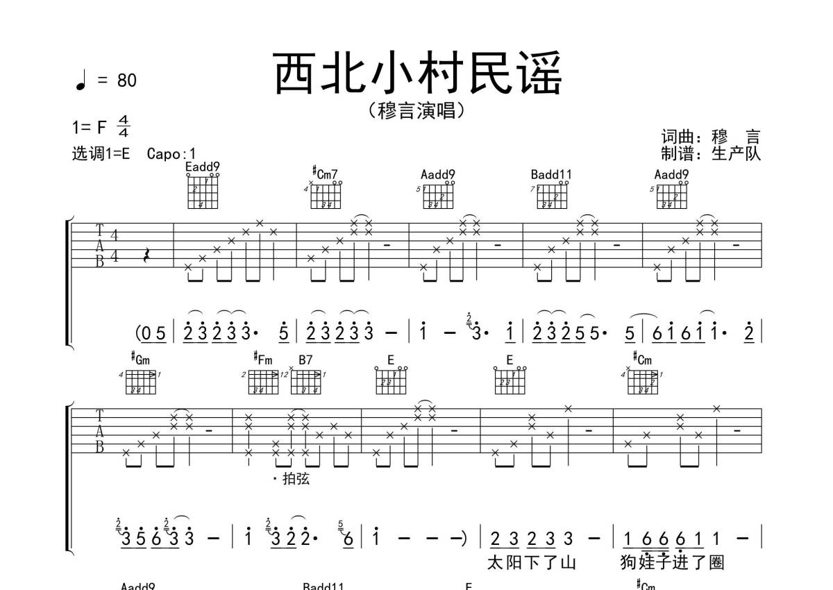 穆言《西北小村民谣》吉他谱 - E调弹唱六线谱